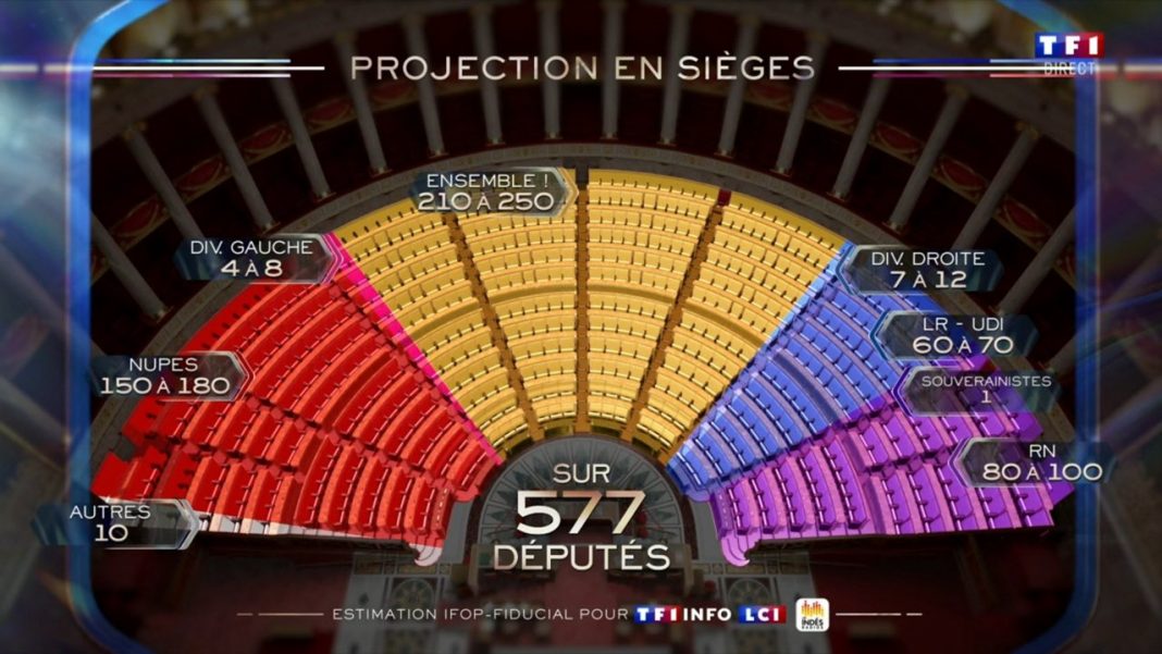 Η παράταξη του Εμανουέλ Μακρόν (Ensemble) φέρεται να απέχει πολύ από την απόλυτη πλειοψηφία, αφού εκτιμάται ότι θα εκλέξει από 208 έως 248 έδρες (289 έδρες είναι απαραίτητες για να επιτευχθεί η πλειοψηφία).