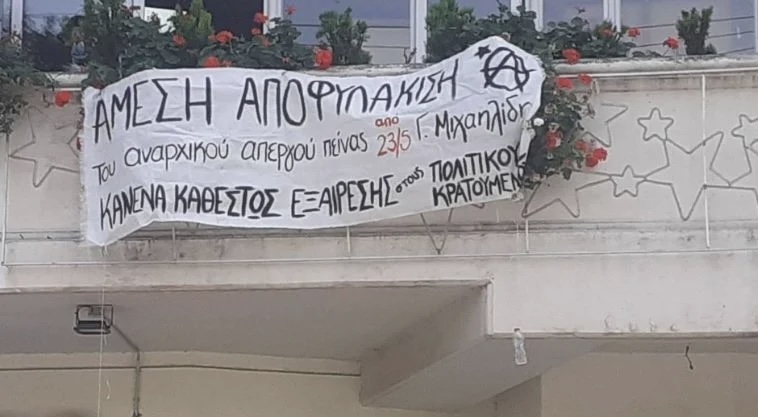 Οι 15 αντιεξουσιαστές μπήκαν στο δημαρχείο, πέταξαν τρικάκια, ενώ άπλωσαν και πανό με ως ένδειξη αλληλεγγύης στον κατηγορούμενο για συμμετοχή σε τρομοκρατική οργάνωση Γ. Μιχαηλίδη (γνωστός ως Τοξοβόλος), ο οποίος έχει προχωρήσει σε απεργία πείνας.