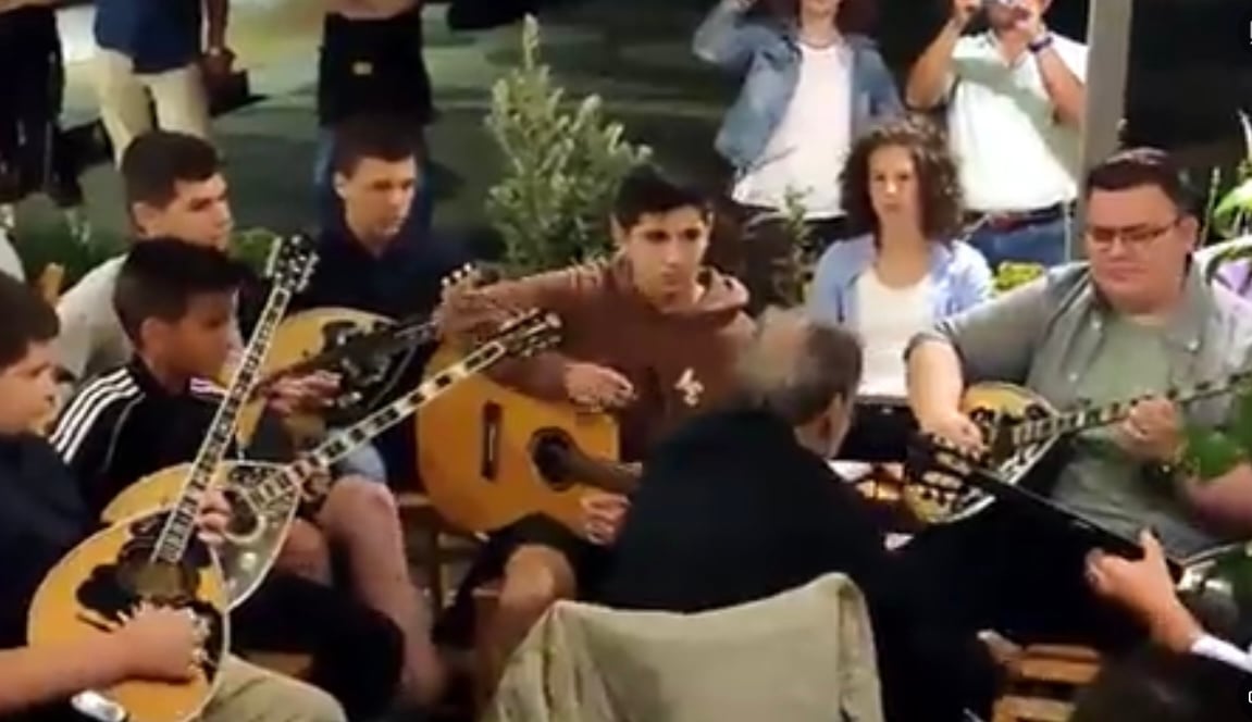 Ο μεγάλος μουσικός Σταύρος Ξαρχάκος καθοδηγεί με το ίδιο πάθος και μεταδοτικότητα που θα το έκανε σε μία κανονική ορχήστρα, παιδιά σε ταβέρνα της Σύρου ώστε να παίξουν την Φραγκοσυριανή.