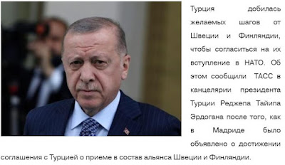 Αυτό αναφέρει το πρακτορείο TASS επικαλούμενο το γραφείο του Τούρκου προέδρου Ρετζέπ Ταγίπ Ερντογάν, αφού ανακοινώθηκε στη Μαδρίτη ότι επιτεύχθηκε συμφωνία με την Τουρκία για την ένταξη της Σουηδίας και της Φινλανδίας στη Συμμαχία.