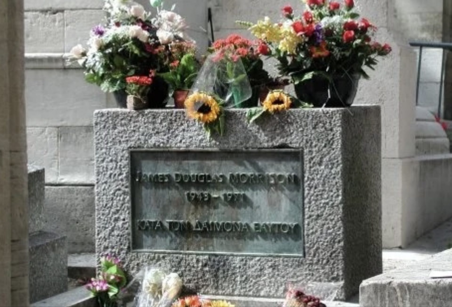 Ο τάφος του Τζιμ Μόρισον με την ελληνική γραφή.«Πράττω κατά του δαίμονα εαυτού» σημαίνει «Πράττω σύμφωνα με αυτό που η συνείδηση μου θεωρεί».