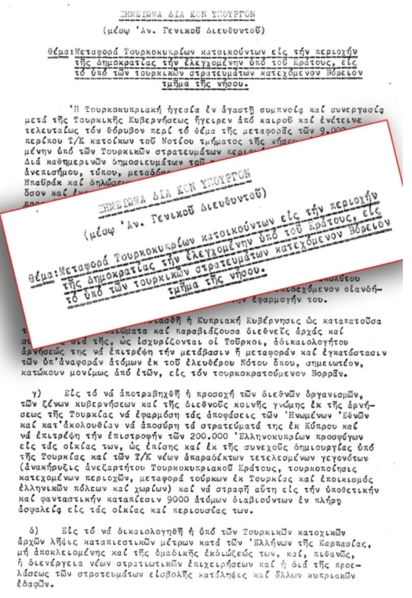 Ο συνάδελφος δημοσίευσε και σχολίασε ένα εξαιρετικής σημασίας, σημείωμα,  του κ. Θεόφιλου Θεοφίλου, πρώην της διπλωματικής υπηρεσίας της Κυπριακής Δημοκρατίας, ημερομηνίας 25 Ιουλίου 1975 προς τον τότε Υπ. Εξωτερικών (ΚΔ) Ιωάννη  Χριστοφίδη. Προειδοποιώντας με τρανταχτά τεκμήρια να μην δεχόντουσαν το τουρκικό αίτημα για μετακίνηση Τ/κ από τα ελεύθερα στα κατεχόμενα, πιο καθαρά ανταλλαγή πληθυσμών.