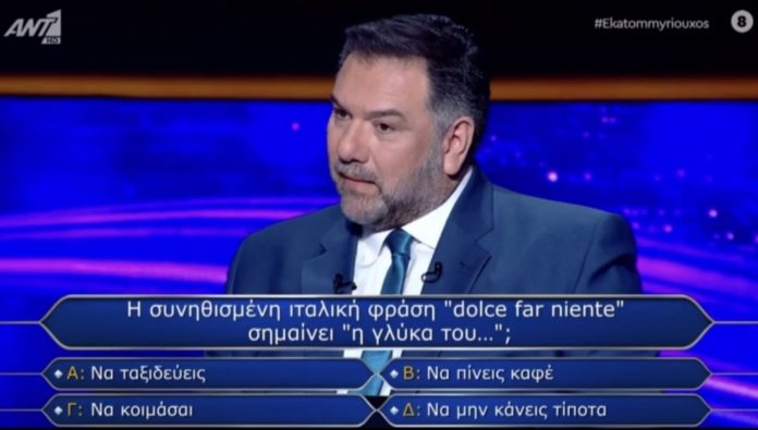 Τι σημαίνει η ιταλική φραση Dolce far niente ήταν η ερώτηση με τον Γρήγορη Αρναούτογλου να κοιτάζει πονηρά σαν να λέει εδώ τωρα θα την πατήσει η παιχτρια. Έλα όμως που η γυναίκα που είχε απέναντι του ο Αρναούτογλου ήταν αστέρι και στα ιταλικά. Έκανε την μετάφραση και αποστόμωσε τον παρουσιαστη που του κόπηκε το … Συνεχίστε να διαβάζετε το Χαμός ξανά με τον Γρήγορη Αρναούτογλου στο Ποιος θέλει να γίνει εκατομμυριούχος: Η παιχτρια σαΐνι στα ιταλικά που τους αποστόμωσε όλους.