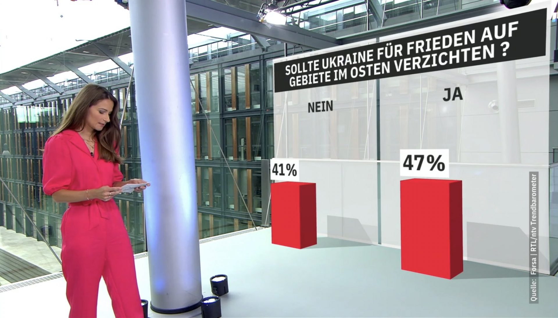 Τα γερμανικά τηλεοπτικά κανάλια RTL & n-tv ρώτησαν τους Γερμανούς εάν η Ουκρανία έπρεπε να παραδώσει εδάφη στη Ρωσία για να επιτευχθεί «ειρήνη». Η πλειοψηφία των Γερμανών συμφώνησε.