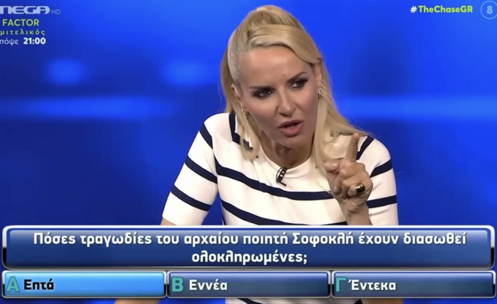 Με μια ερώτηση που αφορούσε τις τραγωδίες του Σοφοκλη έκλεισε τη σεζόν το τηλεπαιχνίδι The Chase που παρουσιάζει η Μαρια Μπεκατωρου. Η ερώτηση ήταν πόσες τραγωδίες του Σοφοκλη σώζονται ολόκληρες και η σωστή απάντηση πως σώζονται 7, ερώτηση στην οποια απάντησε και σωστά ο παιχτης που προσχώρησε στον μεγαλο τελικό.