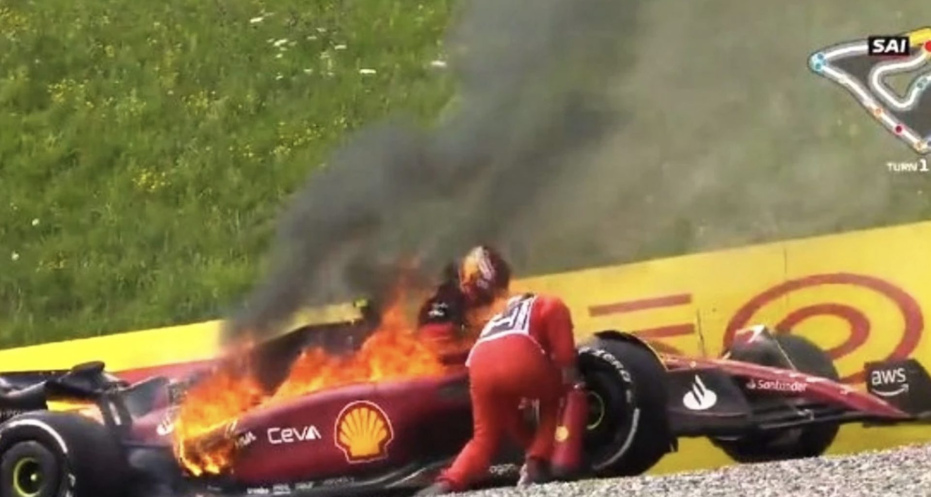 Ένα ακόμη grand prix της Formula 1, ένα ακόμη σοκαριστικό ατύχημα, με «θύμα» αυτή τη φορά τον Ισπανό πιλότο της Ferrari Κάρλος Σάινθ, το μονοθέσιο του οποίο άρπαξε φωτιά εν κινήσει!