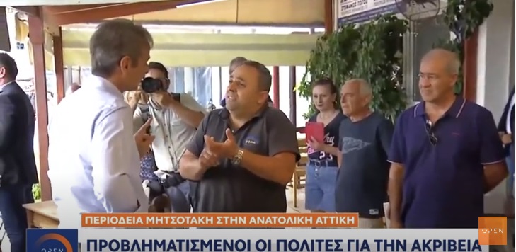 Όπως φαίνεται από το παρακάτω βίντεο, ο πρωθυπουργός πιάστηκε απροετοίμαστος στο λιμάνι της Ραφήνας, όταν καταστηματάρχης εξέφρασε τα παράπονά του για τους δραματικούς λογαριασμούς ρεύματος που πληρώνει. Μεταξύ άλλων είπε στον πρωθυπουργό μέσα σε μόλις τρεις μήνες έχει πληρώσει 6.500 ευρώ, με τον Κυριάκο Μητσοτάκη να πουλάει «τρέλα» και να απαντάει ότι… καλά είναι.