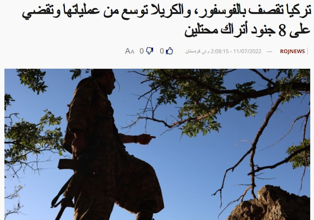 Το κέντρο ΜΜΕ των Δυνάμεων Λαϊκής Άμυνας επιβεβαίωσε, μέσω ανακοίνωσής του, το θάνατο 8 Τούρκων στρατιωτών κατοχής, σε μια σειρά ποιοτικών επιχειρήσεων που διεξήγαγαν οι μαχητές- αντάρτες για την απελευθέρωση του Κουρδιστάν στις νόμιμες αμυντικές περιοχές, σημειώνοντας ότι «ο τουρκικός στρατός κατοχής χρησιμοποίησε βόμβες «φωσφόρου» αυτή τη φορά σε περιοχές  στα νότια του Κουρδιστάν (βόρειο Ιράκ)».