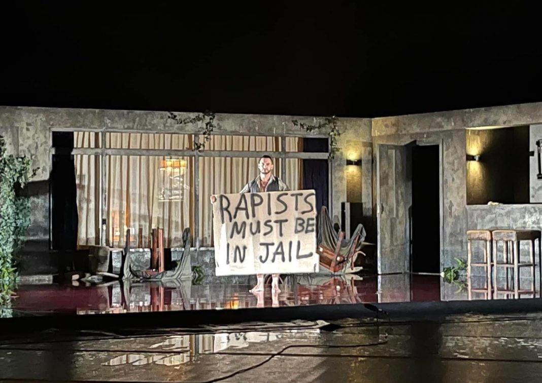 Στην υπόκλιση της παράστασης των Peeping Tom ο χορευτής Πάνος Μαλακτός έβγαλε πάνω στη σκηνή πανό που έγραφε: