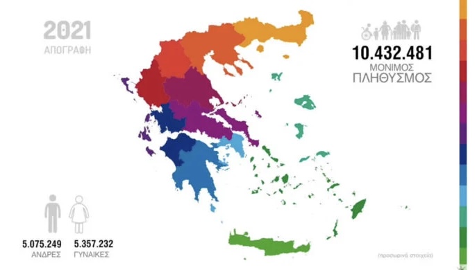 Το 2011 ο μόνιμος πληθυσμός της Ελλάδας ήταν 10.816.286 ενώ το 2021 ανέρχεται σε 10.432.481. Μέσα σε 10 χρόνια λοιπόν η Ελλάδα έχασε μία Πάτρα και έναν Βόλο.