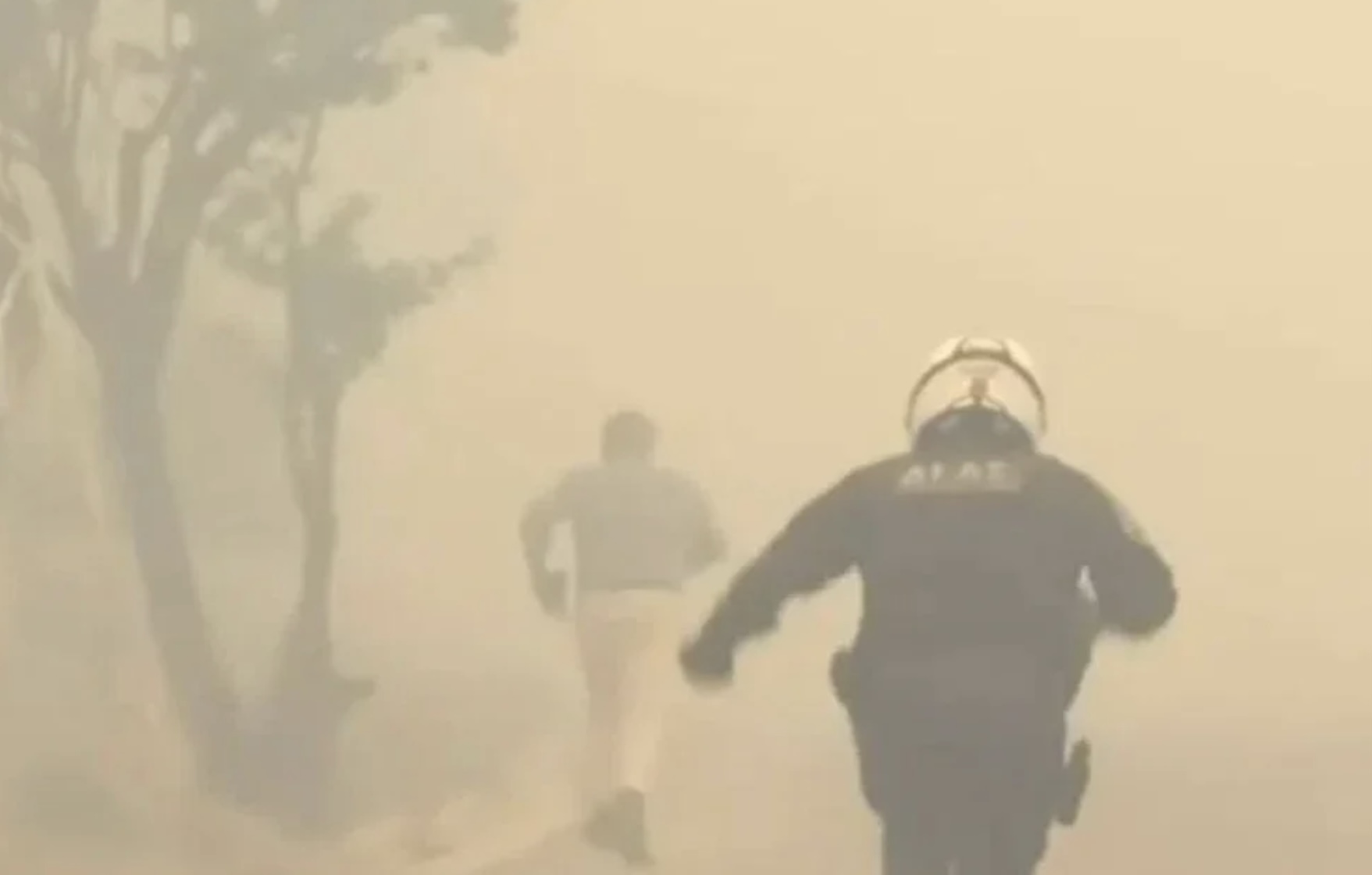 Τρεις αστυνομικοί της ομάδας ΔΙΑΣ άρχισαν να τον κυνηγούν μέσα στους καπνούς και τις φλόγες, για να τον απομακρύνουν και να μην κινδυνεύσει η ζωή του.