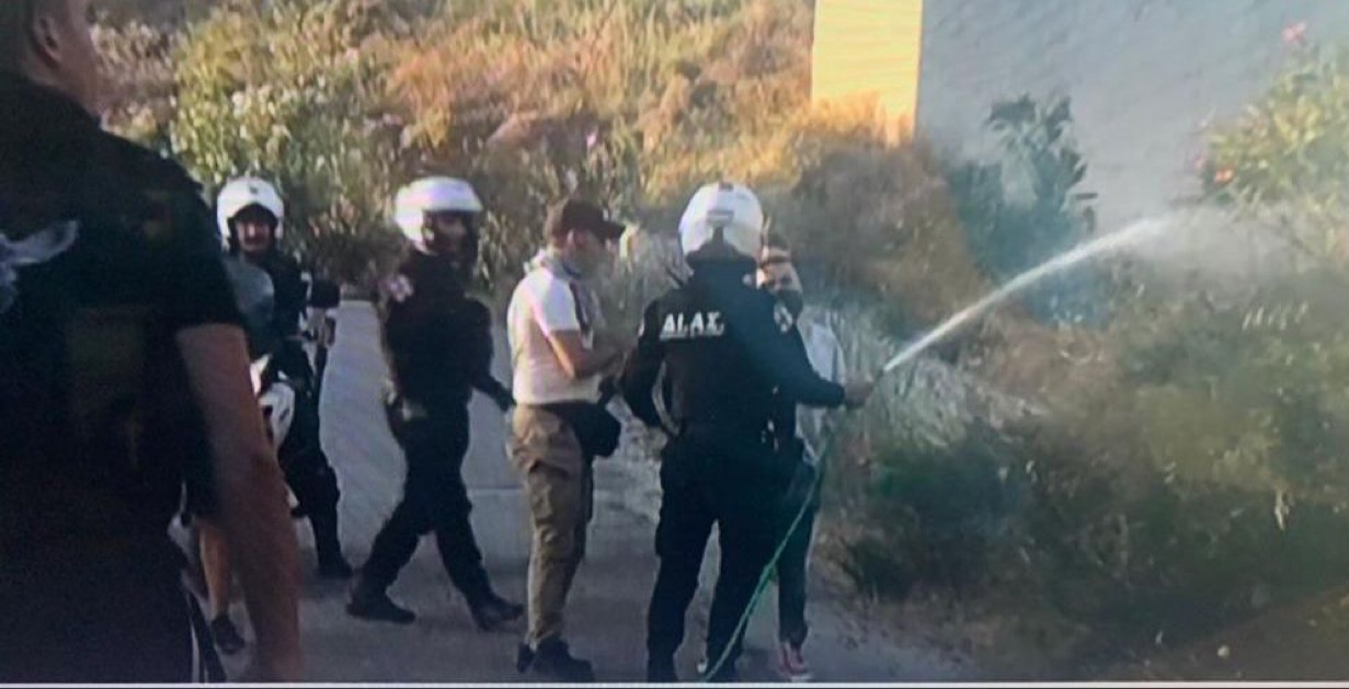 Χωρίς κανέναν κατάλληλο εξοπλισμό, έχοντας στα χέρια τους ποτιστήρια και λάστιχα, αστυνομικοί προσπαθούσαν να βοηθήσουν στην κατάσβεση.