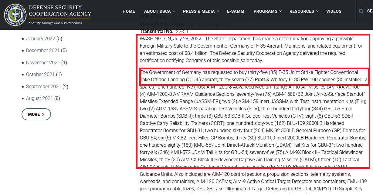 Η κυβέρνηση της Γερμανίας ζήτησε να αγοράσει τριάντα πέντε (35) αεροσκάφη F-35 Joint Strike Fighter συμβατικής απογείωσης και προσγείωσης (CTOL), τριάντα επτά (37) κινητήρες Pratt & Whitney F135-PW-100 (35 εγκατεστημένοι, 2 ανταλλακτικά)