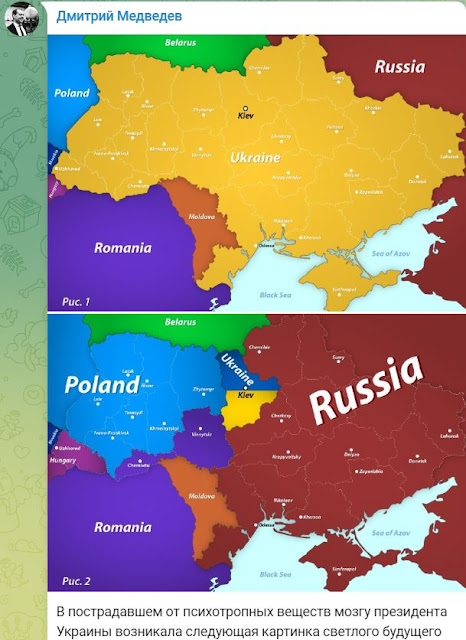 Σε έναν από τους χάρτες που δημοσίευσε ο πρώην Ρώσος πρόεδρος, επτά ουκρανικές περιοχές μεταφέρονται στην Πολωνία, μία στην Ουγγαρία, δύο στη Ρουμανία και 13 περιοχές συν τη χερσόνησο της Κριμαίας στη Ρωσία.