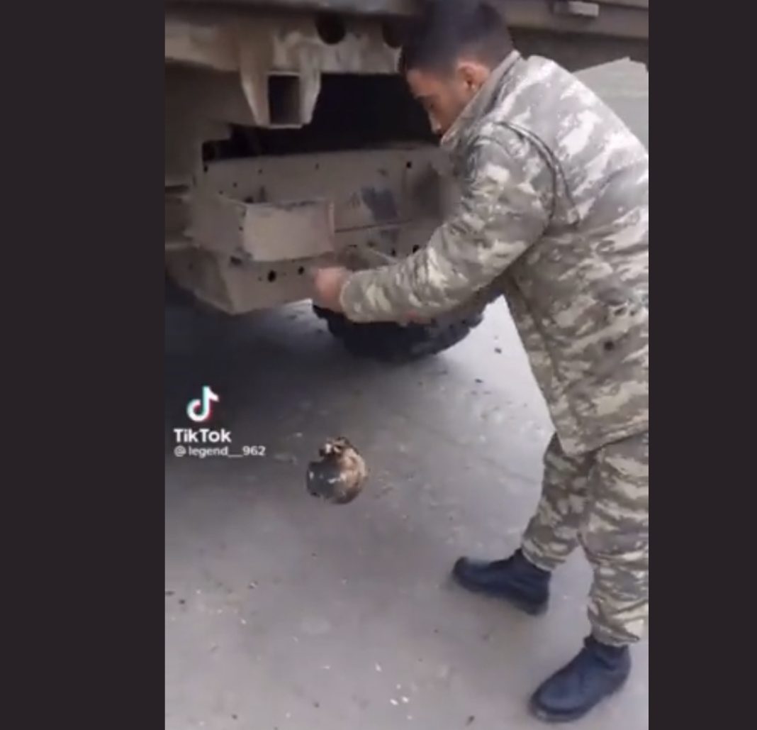 Στο βίντεο που ακολουθεί φαίνονται Αζέροι στρατιώτες να έχουν ξεθάψει ένα κρανίο από αρμενικό νεκροταφείο και να το δένουν σε στρατιωτικό όχημα περιφέροντάς το, με αλαλαγμούς θριάμβου.