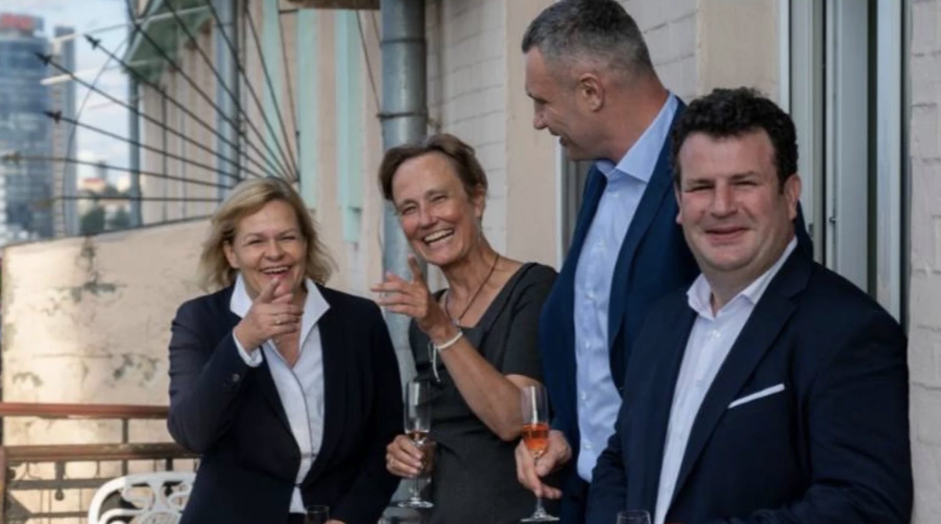 Στη φωτογραφία εικονίζονται πέρα από την Νάνσι Φέζερ (SPD) και τον υπουργό Εργασίας Χουμπέρτους Χάιλ (SPD) και η Γερμανίδα πρεσβευτής στο Κίεβο ΆνκαΦελντχούζεν αλλά και ο δήμαρχος της ουκρανικής πρωτεύουσας, Βιτάλι Κλίτσκο, όλοι με ποτήρι στο χέρι και πλατιά χαμόγελα.