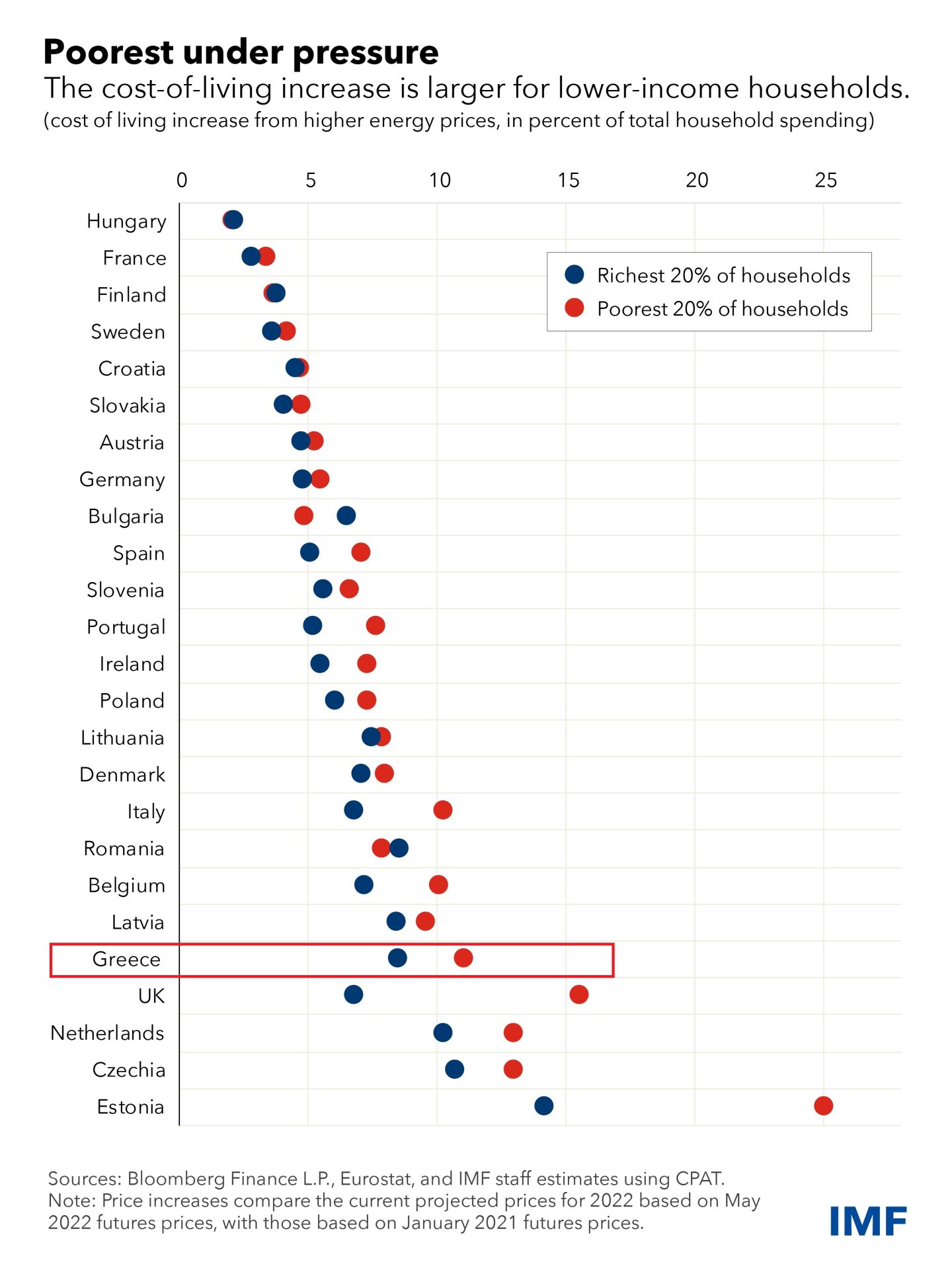 Η Ευρώπη αντιμετωπίζει ένα τεράστιο σοκ στην τιμή της ενέργειας. Αλλά δεν πρόκειται όλοι οι Ευρωπαίοι να δουν το ίδιο πλήγμα στο βιοτικό τους επίπεδο. Σύμφωνα με εκτιμήσεις του ΔΝΤ , η επιβάρυνση για τη μέση οικογένεια στη Φινλανδία θα ισοδυναμεί με ένα επιπλέον 4% των δαπανών των νοικοκυριών. Η εικόνα είναι πολύ πιο ζοφερή σε μια δίωρη διαδρομή με το φέρι στη Βαλτική Θάλασσα. Στην Εσθονία τα νοικοκυριά αντιμετωπίζουν ένα χτύπημα περίπου 20%, ενώ στην Ελλάδα το ποσό αυτό ανέρχεται στο 12%