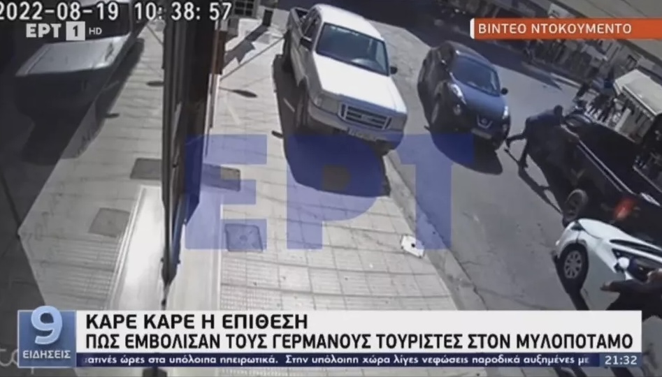 Οι Γερμανοί τουρίστες φαίνονται να ξεφεύγουν, ενώ περαστικοί επεμβαίνουν για να σταματήσει το σοβαρό περιστατικό.