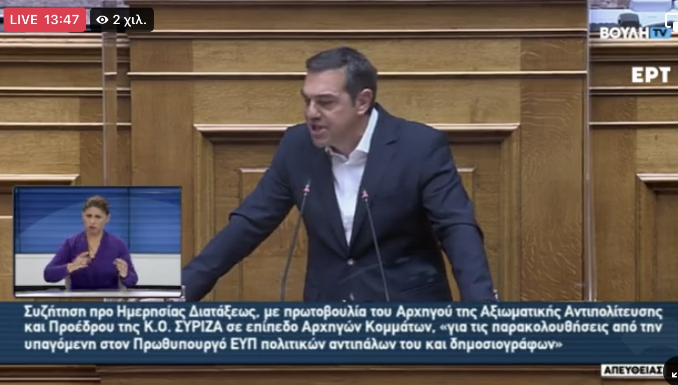 Ομιλία στην προ Ημερησίας Διατάξεως συζήτηση στη Βουλή για τις παρακολουθήσεις από την υπαγόμενη στον Πρωθυπουργό ΕΥΠ πολιτικών αντιπάλων του και δημοσιογράφων.