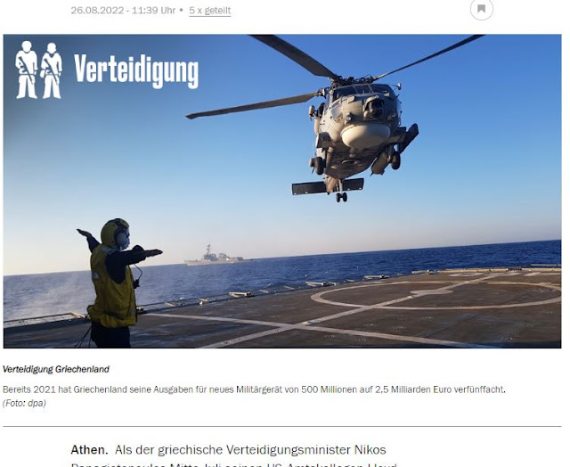 Όπως επισημαίνει περαιτέρω η «Handelsblatt», φέτος η ελληνική κυβέρνηση σχεδιάζει να αυξήσει κατά άλλο ένα τρίτο τα χρήματα για νέους εξοπλισμούς. Σαφώς, η Αθήνα δεν θέλει να αφήσει τίποτα στην τύχη στη μακροχρόνια διαμάχη της με την Τουρκία, η οποία τον τελευταίο καιρό ενεργεί όλο και πιο επιθετικά. Για δεκαετίες, οι δύο εχθρικοί γείτονες αμφισβητούν οικονομικές ζώνες και αποκλειστικά δικαιώματα στην Ανατολική Μεσόγειο.