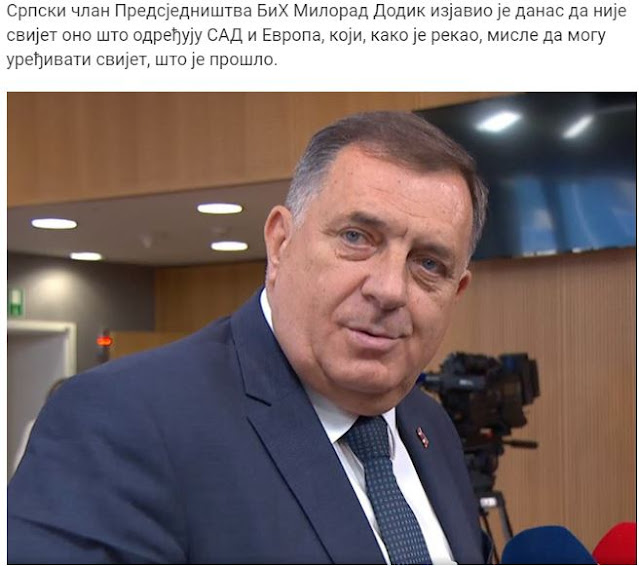 Ο Σέρβος μέλος της Προεδρίας της Βοσνίας-Ερζεγοβίνης(Β-Ε), Μίλοραντ Ντόντικ, δήλωσε σήμερα ότι ο κόσμος δεν καθορίζεται από τις ΗΠΑ και την Ευρώπη, οι οποίες, όπως είπε, πιστεύουν ότι μπορούν να ρυθμίσουν τον κόσμο, αλλά αυτό είναι παρελθόν.