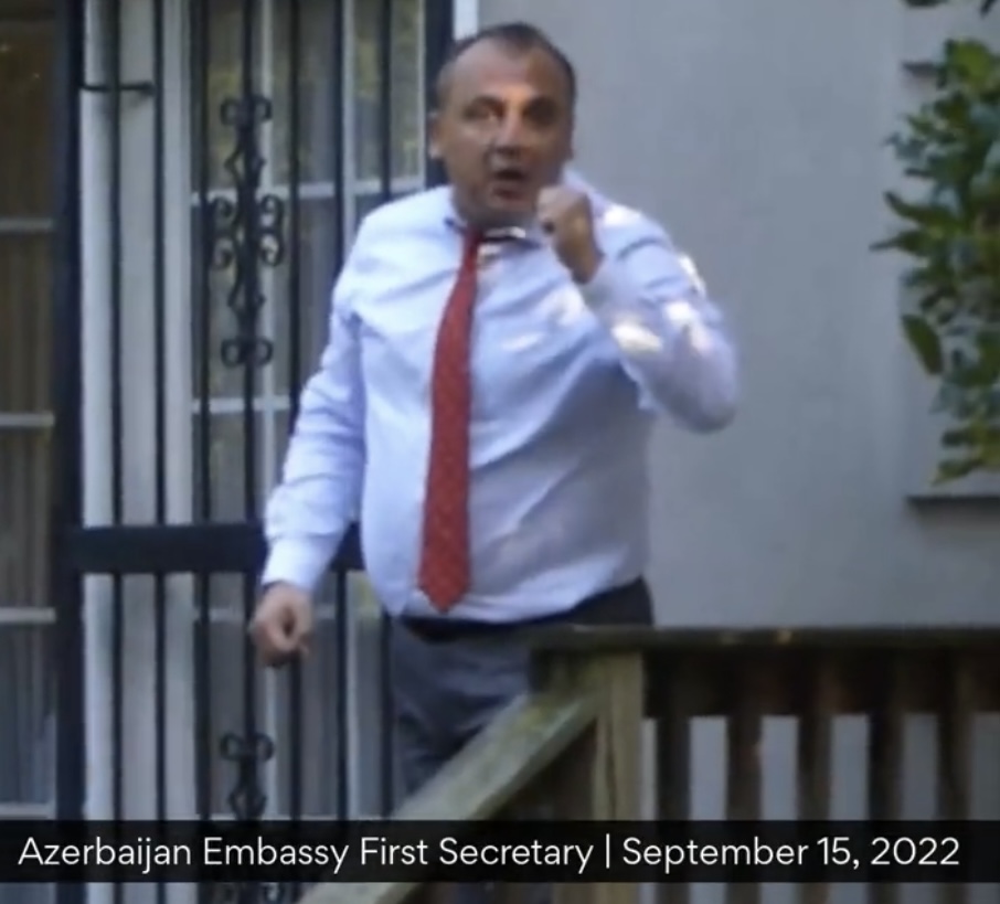 Πρεσβεία του Αζερμπαϊτζάν (Ουάσιγκτον, DC): Ο Πρώτος Γραμματέας της πρεσβείας, Jeyhun Novruzov δημόσια, ρητά και επανειλημμένα απειλεί με σεξουαλική επίθεση γυναίκες που διαμαρτύρονται για τη σφαγή, τα βασανιστήρια και τον ακρωτηριασμό των Αρμενίων από τον στρατό των Αζέρων.