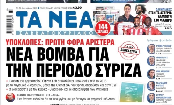 Πρόκειται φυσικά για την αποκάλυψη της εφημερίδας «δημοκρατία» που αφορά την παρακολούθηση 17 ελλήνων βουλευτών, αλλά και εκδοτών, δημοσιογράφων και δικηγόρων, όπως αυτή προέκυψε από την έρευνα του καναδικού οργανισμού Citizenslab. Για την συγκεκριμένη σκοτεινή υπόθεση που συνιστά μάλιστα κατασκοπεία κατά της Ελλάδας, ο εκδότης εφημερίδας «Δημοκρατία» Ιωάννης Φιλιππάκης είχε στείλει σχετική επιστολή στον πρόεδρο της επιτροπής θεσμών και διαφάνειας, Αθανασίου Μπούρα με όλα τα στοιχεία, ώστε η επιτροπή να το διερευνήσει. Η Νέα Δημοκρατία όμως τότε, αρνήθηκε να το κάνει!