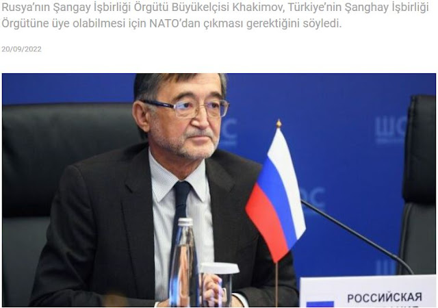 «Ο Ρώσος Πρέσβης στον Οργανισμό Συνεργασίας της Σαγκάης, Χακίμοφ, είπε ότι (η Τουρκία) για να γίνει μέλος του Οργανισμού Συνεργασίας της Σαγκάης, πρέπει να φύγει από το ΝΑΤΟ», γράφει το τούρκικο δημοσίευμα
