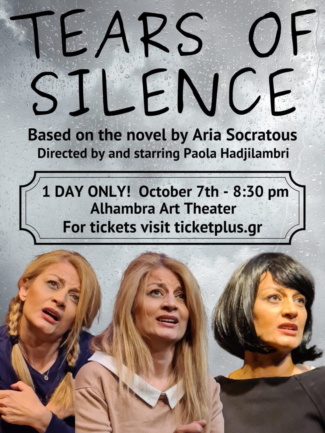 Tο βιβλίο της συγγραφέας κ Άριας Σώκρατους ” Τα Δάκρυα της Σιωπής “, κυκλοφόρησε τον Ιούνιο του 2015 στην Ελλάδα από τις Εκδόσεις Έξη και μετέπειτα προχώρησα στη θεατρική του διασκευή στα αγγλικά. Η πρεμιέρα έγινε την 1η Μαρτίου, 2022 στο The American Theater of Actors στο Broadway και διοργανώθηκε από τον Pancyprian Associationof America και στη συνέχεια παρουσιάστηκε στις 4 Μαρτίου στην Ταμπατης Φλόριντα από την Πανελλήνια Ομοσπονδία της Φλόριντα, στις 16 Μαρτίου έγινε η πρεμιέρα στο Μαρκίδειο Θέατρο στην Πάφο και στις 18 Μαρτίου στη Λευκωσία στην αίθουσα Μελίνα Μερκούρη με την παρουσία της Προέδρου της Βουλής, η οποία δήλωσε μάλιστα πως η Βουλή των Αντιπροσώπων είναι συνδιοργανωτρια, την παρουσία του Αρχηγού της Κυπριακής Αστυνομιας και της Προέδρου της Οργάνωσης Κακοποιημένων Γυναικών ΣΠΑΒΟ.