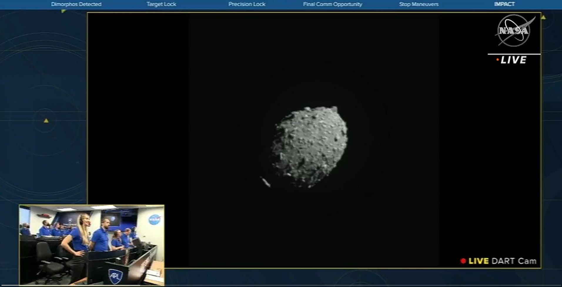 Μια πρώτη πρόβα πλανητικής προστασίας πραγματοποιήθηκε τη νύχτα σήμερα Τρίτη, όταν η αποστολή DART της NASA έπεσε σε έναν μικρό, ακίνδυνο αστεροειδή με ταχύτητα 6,6 χιλιομέτρων ανά δευτερόλεπτο. Την επιτυχημένη ολοκλήρωση της επιχείρησης ανακοίνωσε η αμερικανική διαστημική υπηρεσία με ανάρτησή της στο Twitter, γράφοντας: «ΕΠΙΤΥΧΗΣ ΠΡΟΣΚΡΟΥΣΗ: Παρακολουθήστε από την #DARTMIssion’s DRACO κάμερα, το διαστημικό σκάφος μεγέθους μηχανής αυτόματης πώλησης να συγκρούεται επιτυχώς με τον αστεροειδή Δήμορφο, ο οποίος έχει το μέγεθος ενός ποδοσφαιρικού σταδίου και δεν αποτελεί κίνδυνο για τη Γη».