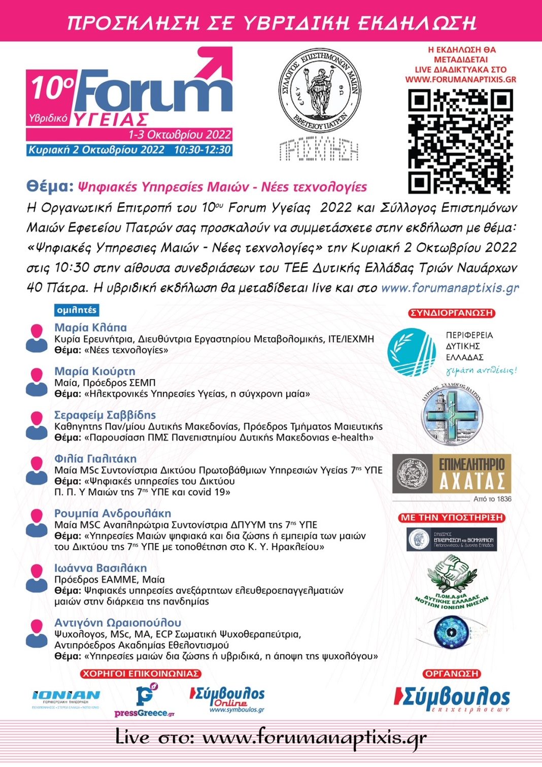 0093CC9A 8FEF 42CA 955E E8DF4197F670Το «10ο Forum Υγείας 2022»  συνδιοργανώνεται  με το Ιατρικό Σύλλογο Πατρών, την Περιφέρεια Δυτικής  Ελλάδας, το Επιμελητήριο Αχαΐας, τον Σύνδεσμο Βιομηχανιών Πελοποννήσου και Δυτικής Ελλάδας και έχει την υποστήριξη της  ΠΟΜ ΑΜΕΑ Δυτικής Ελλάδας και Νοτίων Ιονίων Νήσων  και του  Ινστιτούτου Έρευνας και Καινοτομίας IRIS.