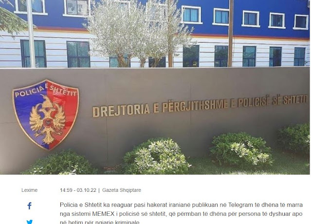 Η Κρατική Αστυνομία αντέδρασε μετά τη δημοσίευση Ιρανών χάκερ στο Telegram δεδομένα που ελήφθησαν από το σύστημα MEMEX της Αλβανικής Κρατικής Αστυνομίας, τα οποία περιέχουν δεδομένα για άτομα που είναι ύποπτα ή υπό έρευνα εγκληματικών πράξεων.