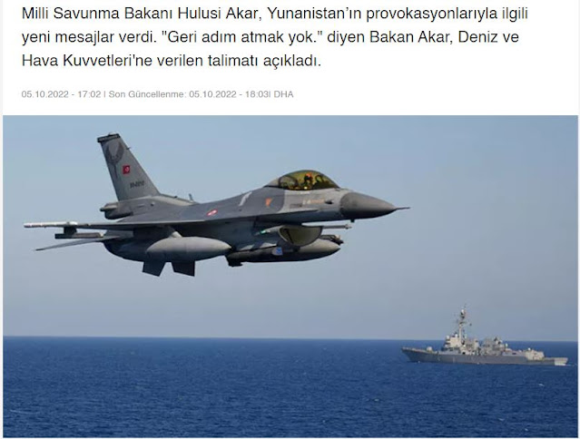 Λέμε «μην παραβιάζετε τα δικαιώματά μας, δεν επιτρέπουμε τετελεσμένα». Μην το εκλάβετε αυτό ως απειλή. Από την άλλη, λέμε «ας μιλήσουμε, εντάξει διάλογος». Μην το εκλαμβάνετε αυτό ως αδυναμία. Είμαστε αποφασισμένοι να προστατεύσουμε τα δικαιώματά μας και το νόμο μας, και είμαστε σε θέση να το κάνουμε αυτό, δόξα τω Θεώ», είπε χαρακτηριστικά ο υπουργός Άμυνας της Τουρκίας.