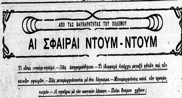 «Μετά τον πόλεμον μεταξύ Ισπανίας και Αμερικής του 1898 και μετά τον πόλεμον του Τράνσβααλ του 1899, όταν συνήλθε το Συνέδριον της Ειρήνης εις την Χάγην, έθεσε μερικούς όρους δια να γίνωνται οι πόλεμοι με πλέον… πολιτισμένον τρόπον. Απηγορεύθη τότε δια κοινής συμφωνίας η καταστροφή πόλεων μη οχυρωμένων και άλλα τινά πράγματα, μεταξύ των οποίων και η χρήσις των σφαιρών των γνωστών με το όνομα: «ντούμ – ντούμ». Είνε δε «ντουμ – ντουμ» κάθε σφαίρα παντός όπλου, η οποία εις το εμπρόσθιον μέρος φέρει ανωμαλίας παντός είδους, δηλ: είνε χαραγμένη, ή ξυσμένη ή φέρει οπήν ή κοιλότητα. Κάθε σφαίρα η οποία δεν είνε λεία και αιχηρά εις το εμπρόσθιον μέρος της, ανοίγει τρομεράν πληγήν εις το σώμα του τραυματίου και σχίζει τους ιστούς γύρω, αφίνουσα μέγα χάσμα, δυσκόλως θεραπευόμενον. Έτσι αι σφαίραι «ντουμ – ντουμ» βασανίζουν τους τραυματίας. Τους φέρουν ταχύτερα προς τον θάνατον ή κάμνουν την θεραπείαν τους δύσκολον, μακροχρόνιον ή και ακατόρθωτον.»