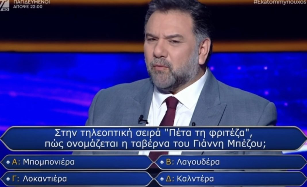 Η ερώτηση αφορούσε την χιλιοπαιγμένη σειρά του Γιάννη Μπέζου στον ΑΝΤ1 Πέτα τη φριτέζα και αφορούσε το ονομα της ταβέρνας που διατηρούσε. Ο παιχτης τα έχασε καθως δεν είχε ξανακούσει την σειρά ούτε την είχε ξαναδεί. Δεν ξέρουμε και αν γνώριζε ποιος ήταν ο Γιαννης Μπέζος.