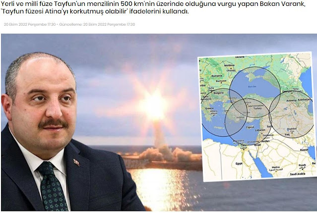 Επεσήμανε ότι ο Tayfun είναι ένας πύραυλος με βεληνεκές άνω των 500 χλμ, και τόνισε: «Μιλάμε για έναν βαλλιστικό πύραυλο εδώ. Μιλάμε για έναν πύραυλο που η εταιρεία μας ROKETSAN ανέπτυξε με δική της έρευνα και ανάπτυξη και παρήγαγε με τη δική της τεχνολογία. Το βεληνεκές του μπορεί να τρόμαξε την Αθήνα: «Πρέπει να το πούμε ξεκάθαρα. Έχουμε ήδη παραγάγει πυραύλους κρουζ με βεληνεκές άνω των 300 χιλιομέτρων πριν από αυτό», είπε.
