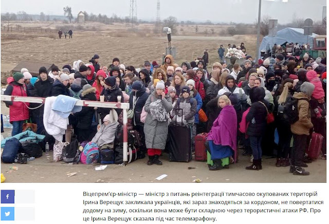 «Η αναπληρώτρια Πρωθυπουργός – Υπουργός Επανένταξης των Προσωρινά Κατεχόμενων Εδαφών Ιρίνα Βερέστσουκ στη διάρκεια ενός τηλεμαραθώνιου προέτρεψε τους Ουκρανούς που βρίσκονται αυτή τη στιγμή στο εξωτερικό να μην επιστρέψουν στην πατρίδα τους για το χειμώνα, καθώς μπορεί να είναι δύσκολο λόγω τρομοκρατικών επιθέσεων από τη Ρωσική Ομοσπονδία», γράφει το ουκρανικό δημοσίευμα.