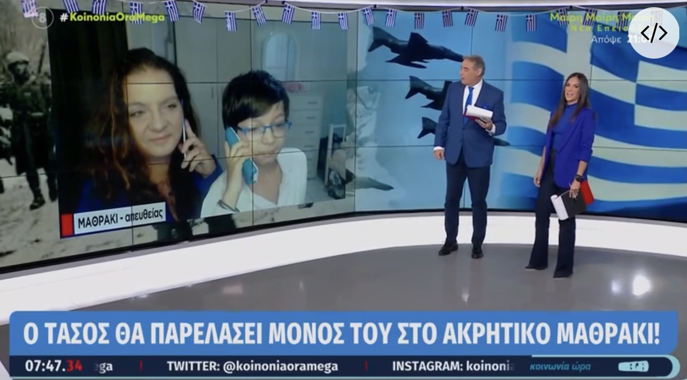 Τέλος, η κ. Τζένη εξήγησε: «Είναι ενήλικες οι φίλοι του όμως γιατί παιδάκια δεν έχει άλλα. Θα κάνει με την δασκάλα του την κ. Λίνα Γρεβενάρη και με έναν κύριο που είναι από εδώ, είναι γυμναστής, τον κ. Μακαντάνη, ο οποίος τους βοηθάει, κάνει γυμναστική μαζί του, και θα κάνουν παρέλαση οι τρεις τους». ΠρωτοσελιδαΕιδήσεις