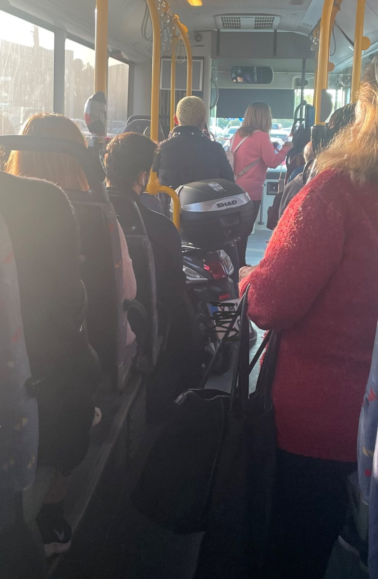 Ένας από τους επιβάτες αποφάσισε να πάρει μαζί του στο λεωφορείο και το δίκυκλό του, όπως ενημέρωσε χρήστης του twitter που τράβηξε και τη συγκεκριμένη φωτογραφία.