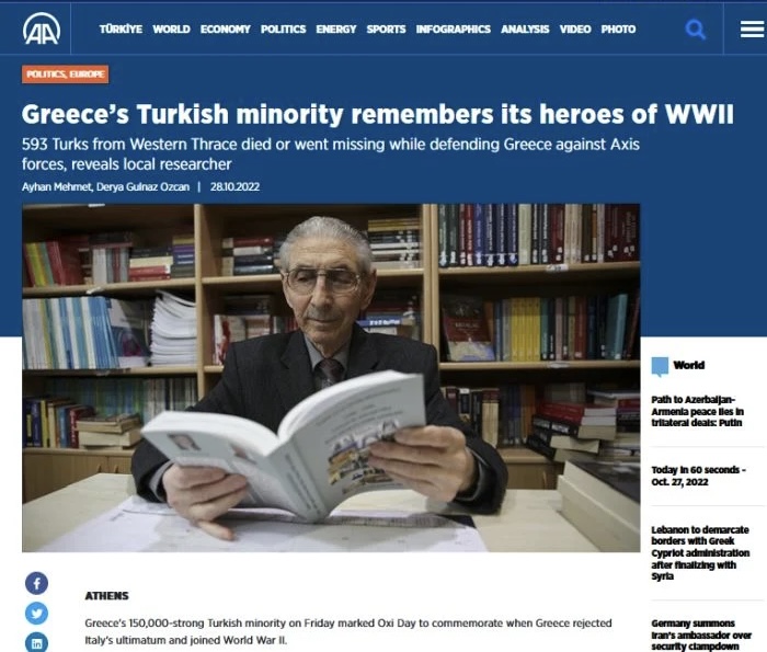 Το κρατικό πρακτορείο ειδήσεων Anadolu παρουσίασε θέμα για την 28η Οκτωβρίου, γράφοντας ότι η «τουρκική» μειονότητα της Δυτικής Θράκης τίμησε τους «593 Τούρκους από τη Δυτική Θράκη που πέθαναν ή χάθηκαν ενώ υπερασπίζονταν την Ελλάδα ενάντια στις δυνάμεις του Άξονα»!
