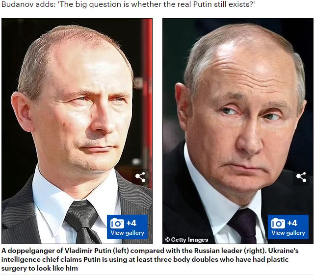 Ο επικεφαλής της στρατιωτικής υπηρεσίας πληροφοριών της Ουκρανίας, υποστράτηγος Κιρίλο Μπουντάνοφ, αποφάσισε ότι ο Ρώσος Πρόεδρος Βλαντίμιρ Πούτιν μπορεί να έχει τρεις ντόπιους, ανθρώπους που έχουν υποβληθεί σε πλαστική επέμβαση για να του μοιάσουν όσο το δυνατόν περισσότερο.