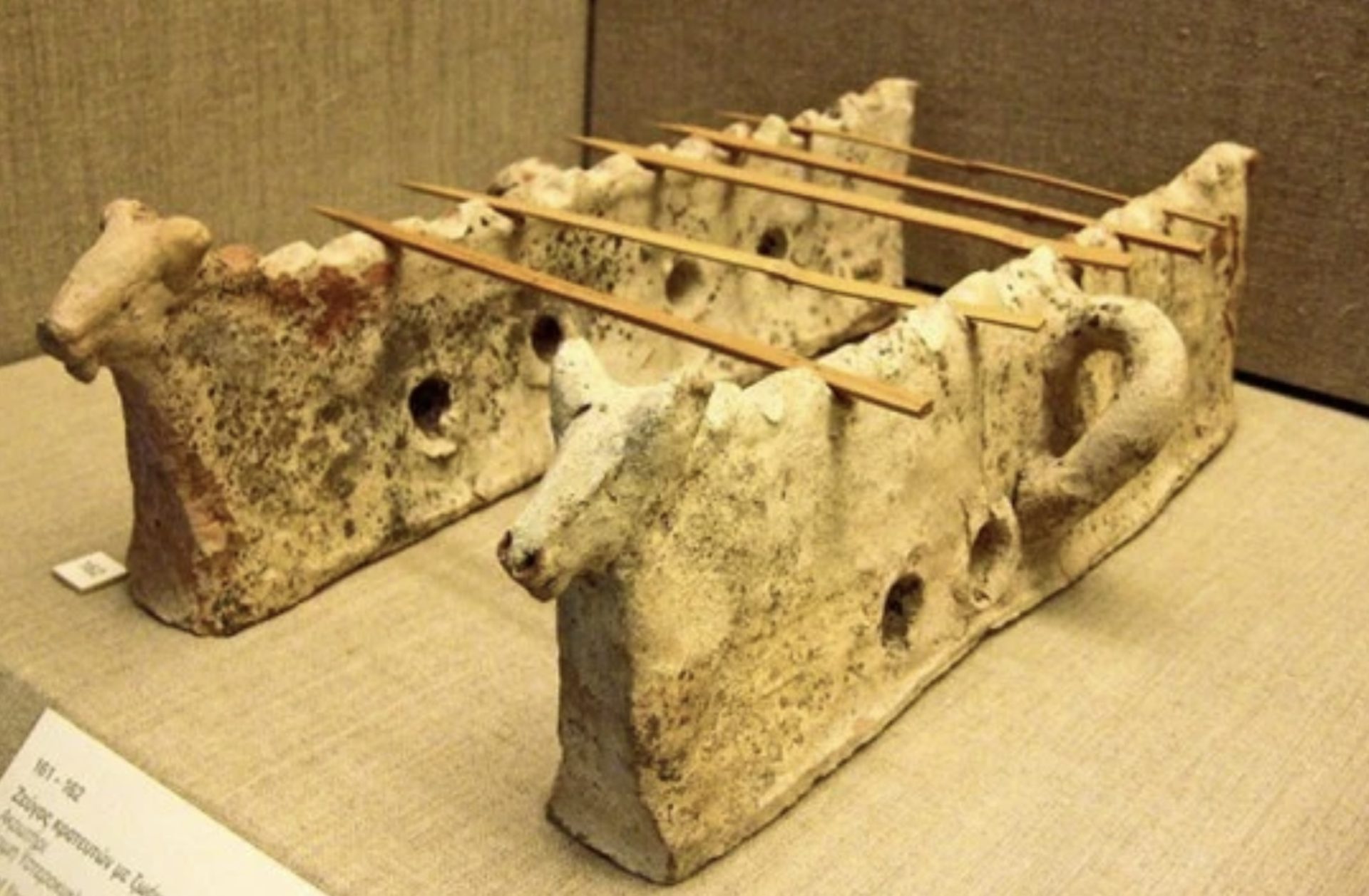 Μοναδικό εύρημα που εκτίθεται στην πρώτη αίθουσα του Μουσείου των Μυκηνών αποτελεί αδιάσειστο τεκμήριο για την προτίμηση των Μυκηναίων στα σουβλάκια: μια φορητή πήλινη εσχάρα όπτησης κρέατος σε καλαμάκια με πλευρά όχι μεγαλύτερη από μισό μέτρο.