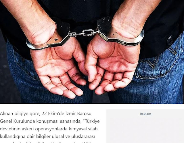 Συγκεκριμένα, συνελήφθη ο δικηγόρος Άριεν Τουράν, ο οποίος υποστήριξε ότι «οι τουρκικές Ένοπλες Δυνάμεις χρησιμοποίησαν χημικά όπλα σε αντιτρομοκρατικές επιχειρήσεις» στην Τακτική Γενική Συνέλευση του Δικηγορικού Συλλόγου της Σμύρνης και ξεκίνησε έρευνα εναντίον του.