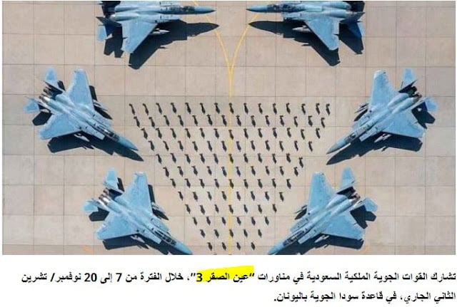 Η Σαουδική Πολεμική Αεροπορία συμμετέχει στους ελιγμούς με πλήθος μαχητικών αεροσκαφών F-15 μαζί με το σύνολο των αεροπορικών, τεχνικών και υποστηρικτικών πληρωμάτων της, σύμφωνα με το (επίσημο) πρακτορείο Τύπου της Σαουδικής Αραβίας.