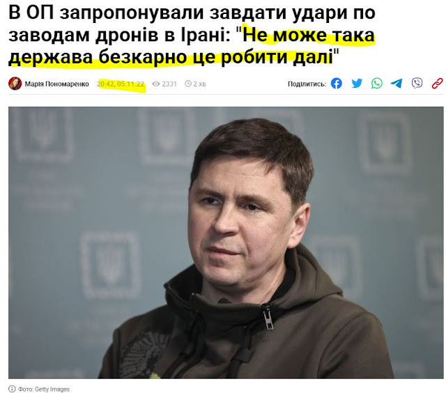 Χαρακτηρίζοντας ως άστοχη την προμήθεια drones στη Ρωσία από το Ιράν πριν από την έναρξη του πολέμου στην Ουκρανία, όπως ισχυρίζονται οι Ιρανοί,  ο σύμβουλος του επικεφαλής του Γραφείου του Προέδρου της Ουκρανίας  Μιχαήλο Ποντόλιακ, πρότεινε ότι οι κυρώσεις και τα εμπάργκο δεν αρκούν για να τιμωρήσουν την Τεχεράνη.