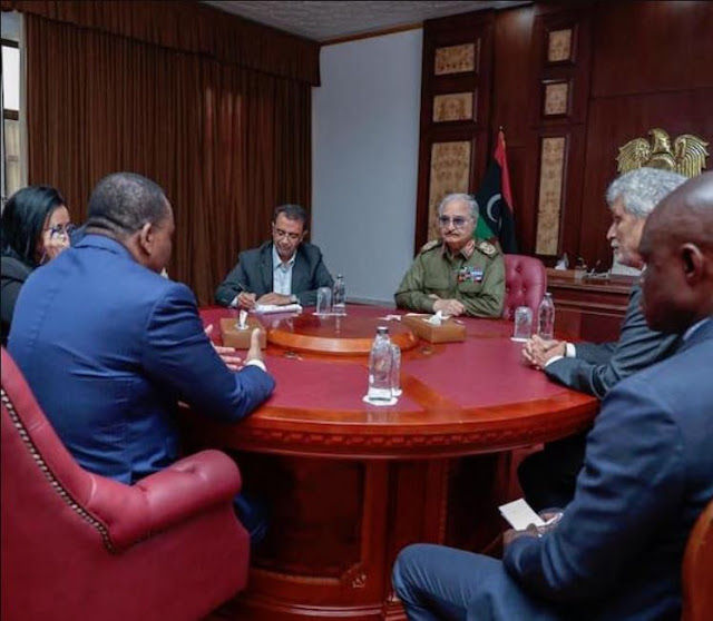 Ο Γενικός Διοικητής του Λιβυκού Εθνικού Στρατού (LNA), Στρατάρχης Χαλίφα Χάφταρ, είχε συνάντηση το Σάββατο στη Βεγγάζη με αντιπροσωπεία της Αφρικανικής Ένωσης, με επικεφαλής τον υπουργό Εξωτερικών του Κονγκό, Ζαν Κλοντ Γκακόσο.