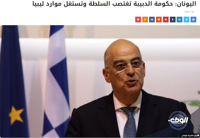 Ο Έλληνας υπουργός Εξωτερικών Νίκος Δένδιας δήλωσε ότι η απερχόμενη κυβέρνηση του Αμπντέλ Χαμίντ αλ Ντμπέιμπα δεν είναι εξουσιοδοτημένη να υπογράψει τις συμφωνίες και αυτή είναι η θέση και των Ηνωμένων Εθνών, γράφει η λιβυκή Αλ Ουατάν.