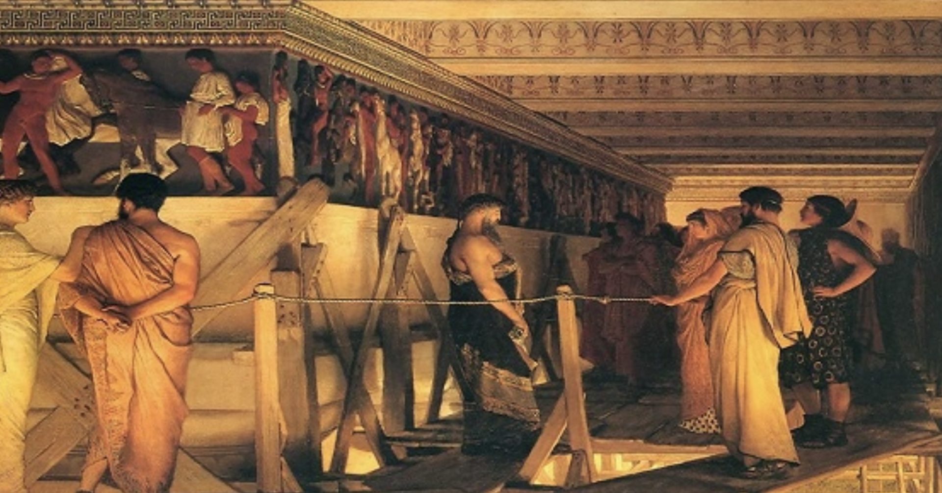 ** Στην πάνω φωτό: Ο Φειδίας δείχνει τη ζωφόρο του Παρθενώνα στους φίλους του (πίνακας του Λώρενς Άλμα-Τάντεμα, 1868)