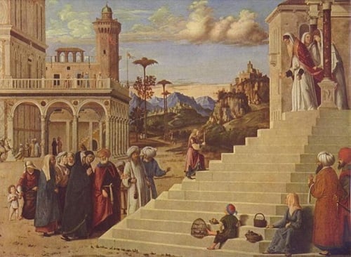 Όταν η Μαριάμ έγινε τριών ετών, οδηγήθηκε από τους γηραιούς γονείς της στο Ναό του Σολομώντος, προκειμένου να εκπληρωθεί το τάμα τους προς τον Θεό. Η Μαρία ανήλθε μόνη της τα 15 σκαλοπάτια που οδηγούσαν στον Ναό και παραδόθηκε από τους γονείς της στα χέρια του ιερέα Ζαχαρία. Αυτός την αγκάλιασε, την ευλόγησε και είπε: «Εμεγάλυνε ο Κύριος το όνομά σου σε όλες τις γενεές. Με σένα θα ευλογηθούν τα έθνη και ο Κύριος θα λυτρώση τους υιούς του Ισραήλ». Στη συνέχεια ανέβασε την τριετή Μαρία στο εσωτερικό του θυσιαστηρίου, όπου ο Θεός της πρόσφερε τη Χάρη του. Το νεαρό κορίτσι υπηρέτησε τον Ναό μέχρι τα 14 χρόνια του, οπότε αρραβωνιάστηκε τον Ιωσήφ και στη συνέχεια έγινε η μητέρα του Ιησού Χριστού.