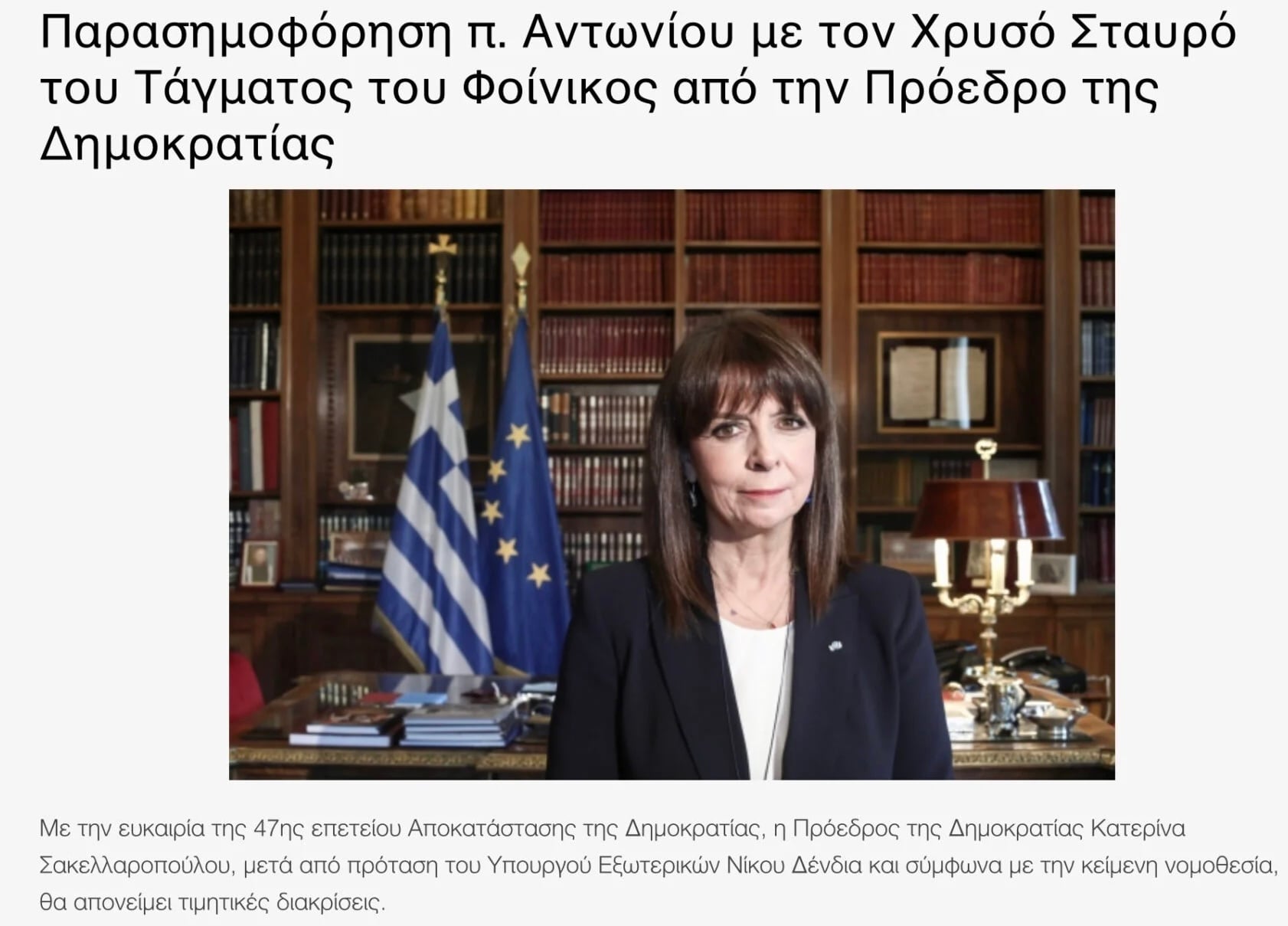 Θα μείνει ούτως ή άλλως στην ιστορία ως η πιο αποτυχημένη πρόεδρος από συστάσεως του ελληνικού κράτους. Τουλάχιστον, λόγω της άμεσης παρέμβασης του Νίκου Δένδια το 2021, μαζί με την βράβευση του αμφιλεγόμενου Ιάσωνα Αποστολοπούλου, φαίνεται ότι ακυρώθηκε και η παρασημοφόρηση του πατέρα Αντωνίου από την Κιβωτό του Κόσμου.